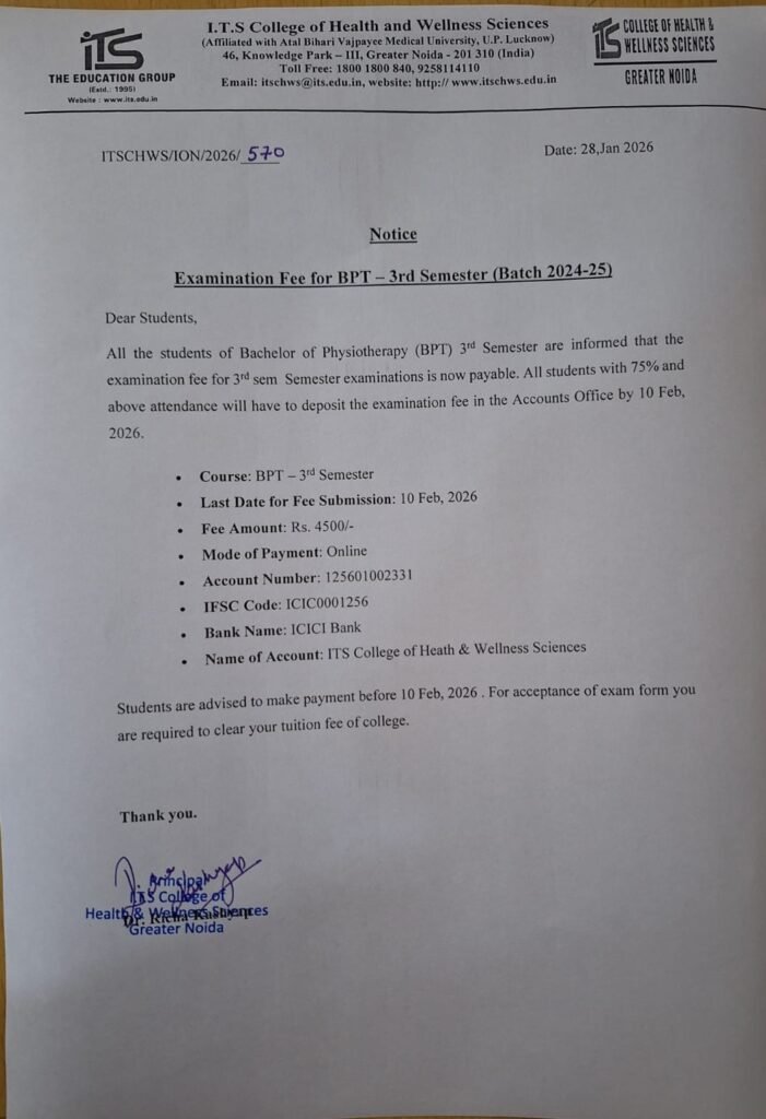BPT 3rd Sem exam fees Notice- 24-25 session